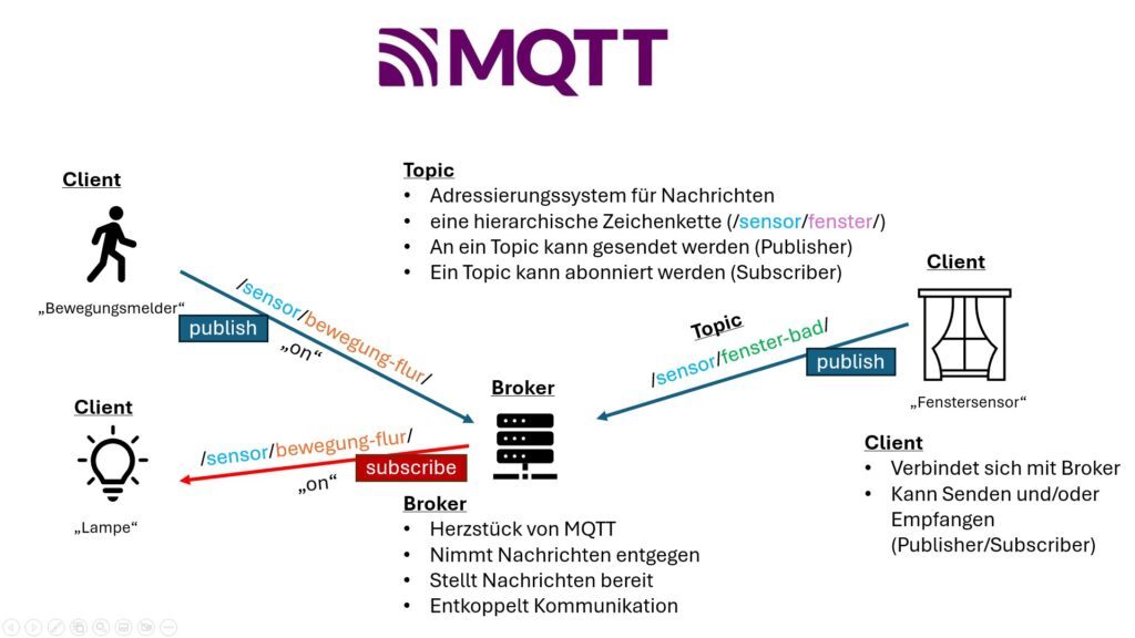 - Client: Jedes Gerät, das mit dem Broker kommuniziert, ist ein Client. Das kann z. B. ein Fenstersensor, ein Bewegungsmelder oder auch eine Lampe sein.