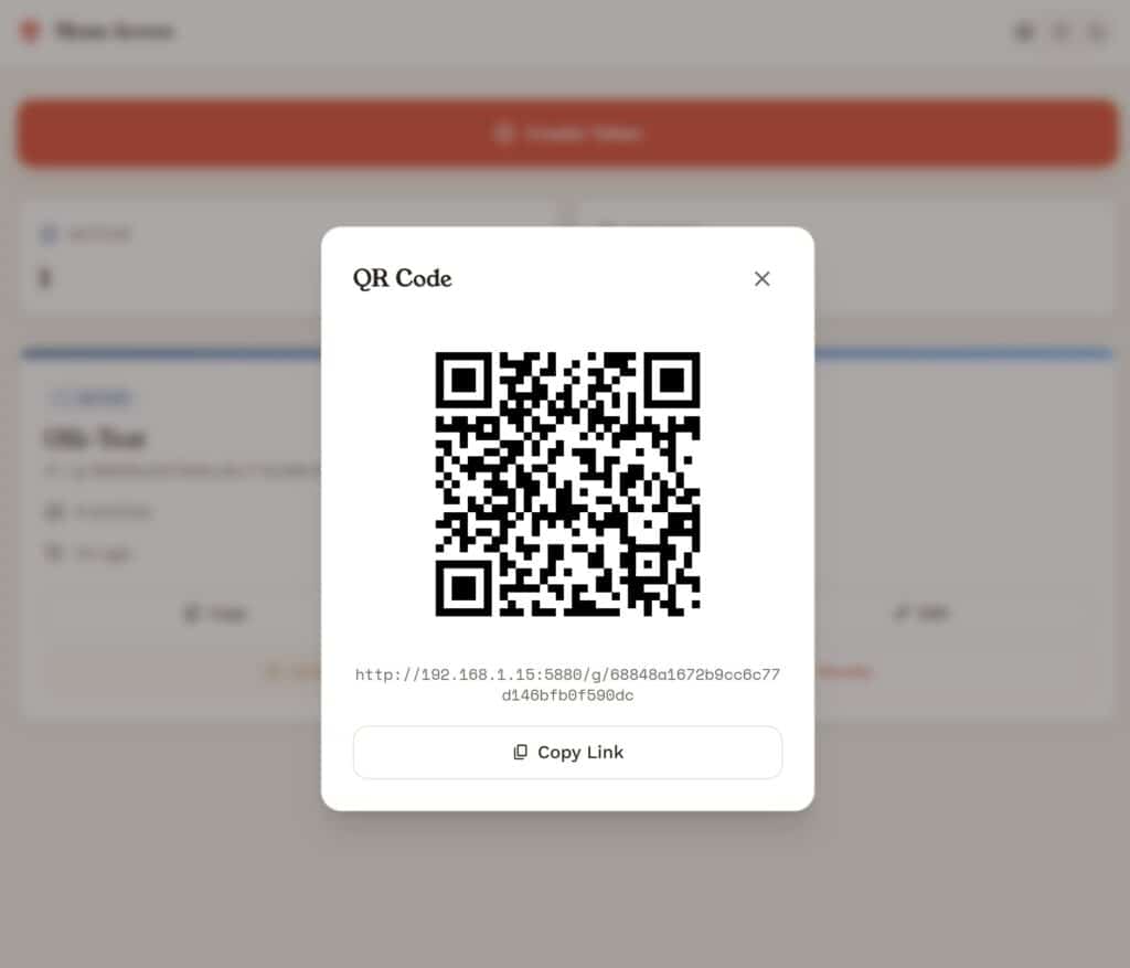 4. Teilen und Steuern Nach dem Klick auf „Create“ wird der temporäre Zugang erstellt. Du kannst dir nun einen QR-Code anzeigen lassen, den dein Gast einfach mit seinem Smartphone scannt. Alternativ kopierst du den Link und verschickst ihn bequem per WhatsApp. Der Gast öffnet den Link und sieht eine aufgeräumte, simple Oberfläche, auf der nur die freigegebenen Geräte (z. B. die Lampe am Sessel) auftauchen, und kann diese sofort steuern – inklusive Dimmfunktion.
