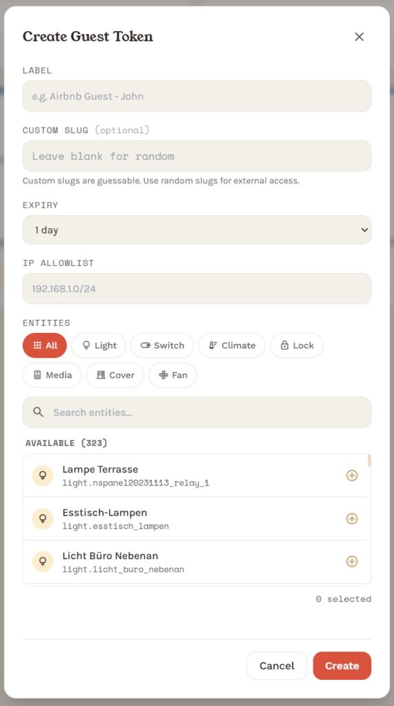 - Geräteauswahl: Wähle über die praktische Such- und Filterfunktion genau die Entitäten (Lampen, Rollläden, Schalter) aus, die der Gast steuern darf.
